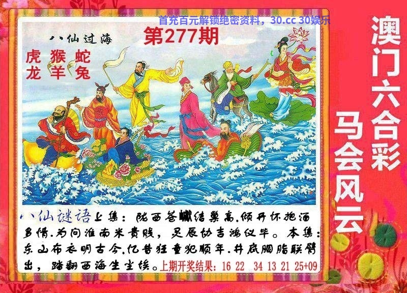275期:【八仙过海】 【雪云初卷定山高,天翁老去更多情,还送郑超米千石,良霄梦吉协熊祥】 解:意思是天翁解出天肖牛猪兔龙马猴 生肖:猴龙羊鸡虎蛇 |