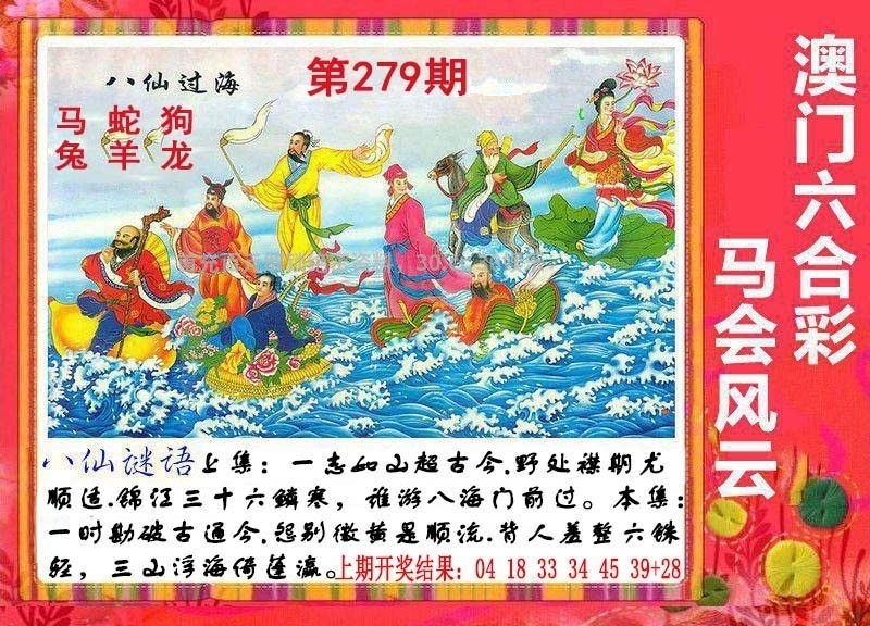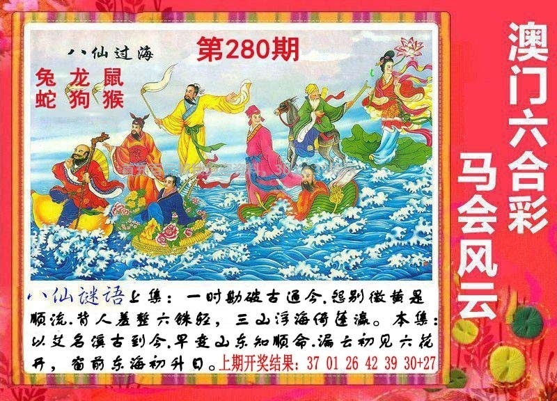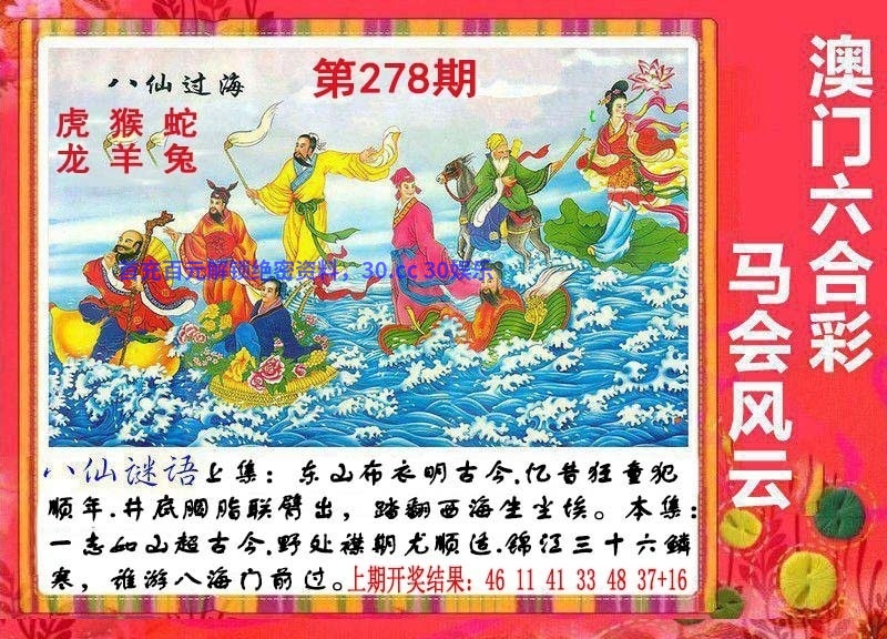 278期:【八仙过海】 【一志如山超古今,野处襟期尤顺适,锦汪三十六鳞寒,谁游八海门前过】 解:意思是三十六解出36号生肖马,八海解出水肖鼠猪 生肖:龙猪牛鼠马虎 |
