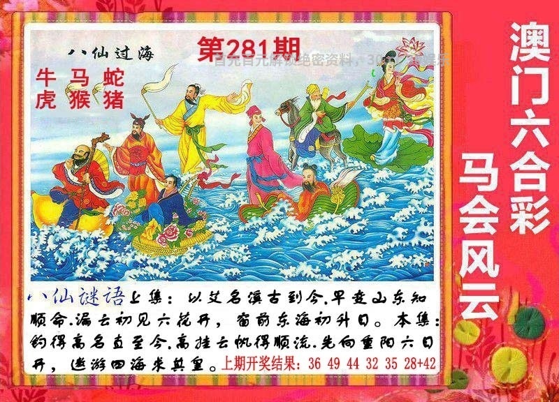 282期:【八仙过海】 【玉石鱼龙换古今,不用绿他耳顺年,杯中三万六千日,旧山旧海悠且长】 解:意思是鱼龙解出明肖龙,三万六解出大数,海解出水肖鼠猪 生肖:马鸡鼠龙猴羊 |